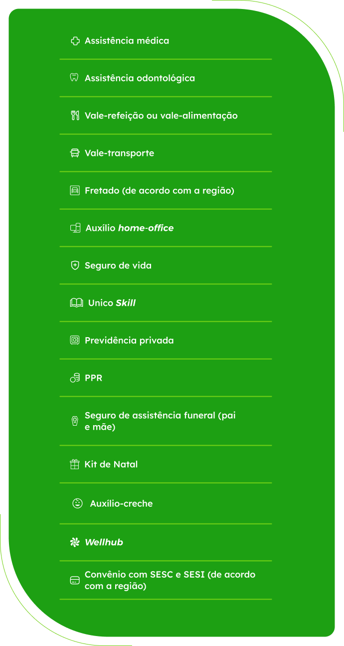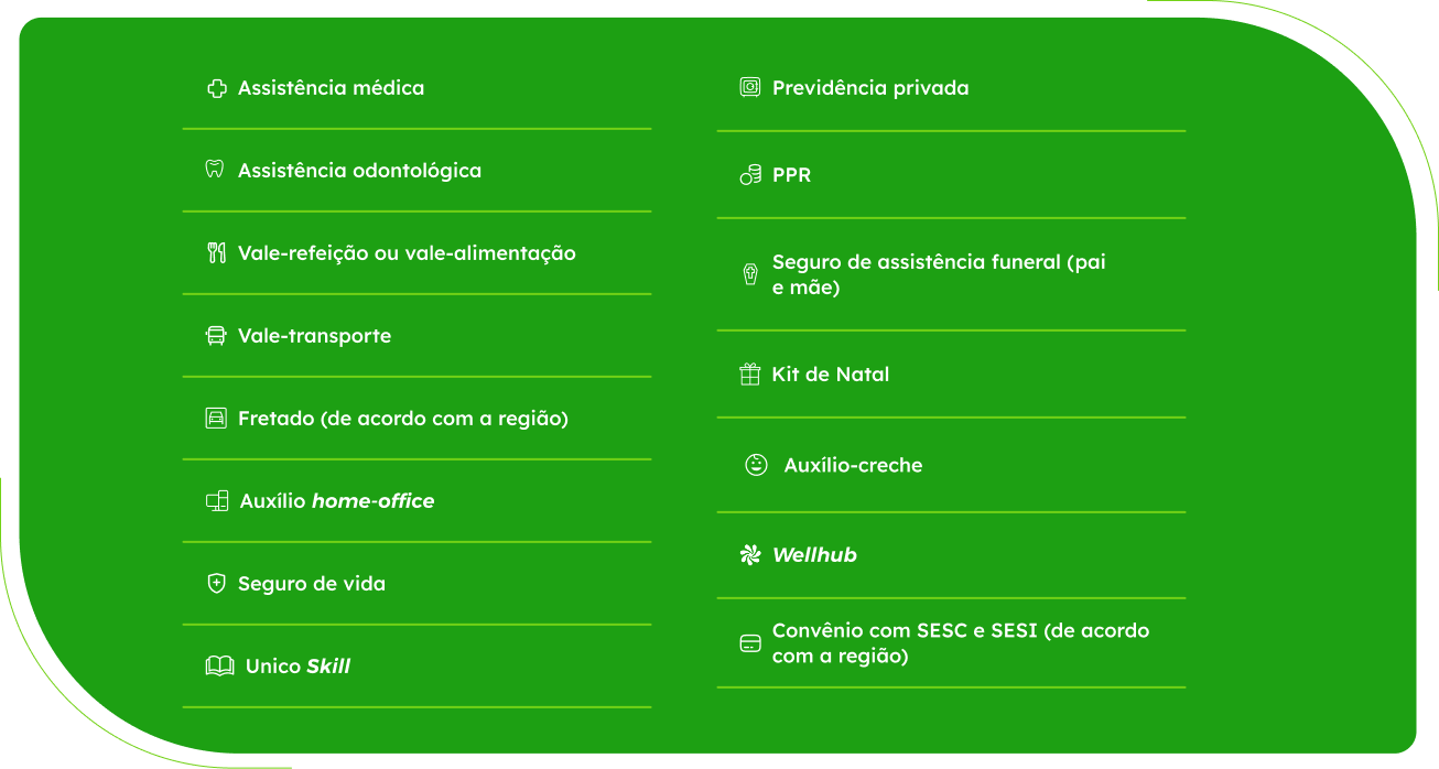 Nossa universidade corporativa oferece programas e trilhas para o desenvolvimento contínuo dos nossos talentos, além do benefício educacional Unico Skill – uma assinatura única que garante acesso a até 26.800 conteúdos em diversas modalidades de formação, como graduação, pós-graduação, idiomas e muito mais.